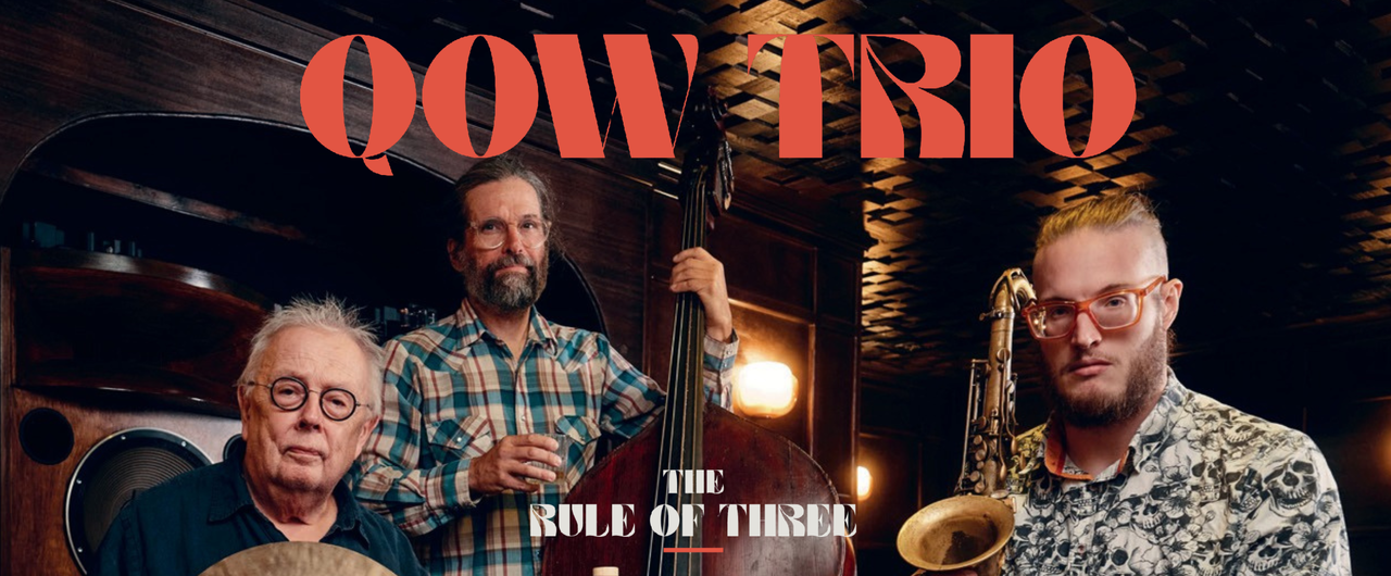 QOW TRIO are back with a barnstorming third album on the prestigious Whirlwind Records, with the fearless threesome roaming further than ever before into the uncharted hinterlands where the deep jazz tradition of the tenor trio, laden with melody and swing, ventures into the untamed regions of free improvisation. At the heart of the band is the unmistakeable beat of drummer Spike Wells, who this year celebrates his 80th birthday and the 65th year of his extraordinary career at the forefront of UK jazz, providing the driving force behind everyone from Tubby Hayes to Bobby Wellins to Stan Getz to Roland Kirk and countless others. Spanning the generations and riding at at his side are rising star saxophonist Riley Stone-Lonergan, whose intriguing compositions and boundless creative imagination as an improvisor continue to dazzle and delight, and big-toned bassist Eddie Myer rounding up the posse. Their first album ‘QOW TRIO’ was selected as critic’s choice by Jazzwise Magazine for 2021. The follow-up ‘The Hold Up’ was described by BBC Music Magazine as ‘a stunning achievement” and awarded 4**** by The Times and The Scotsman. They’ve spent the intervening time touring across the UK and EU and developing their sound to a new creative peak. Now ‘The Rule Of Three’ shows that three really is the magic number with their most coherent, wide-ranging and adventurous set of recordings yet. From Ayler to Strayhorn, from be-bop to calypso, from cowboy movie to free-jazz shootout, there’s a surprise at every turn, but always delivered with total sincerity and conviction and a driving desire to bring the audience with them every step of the way.